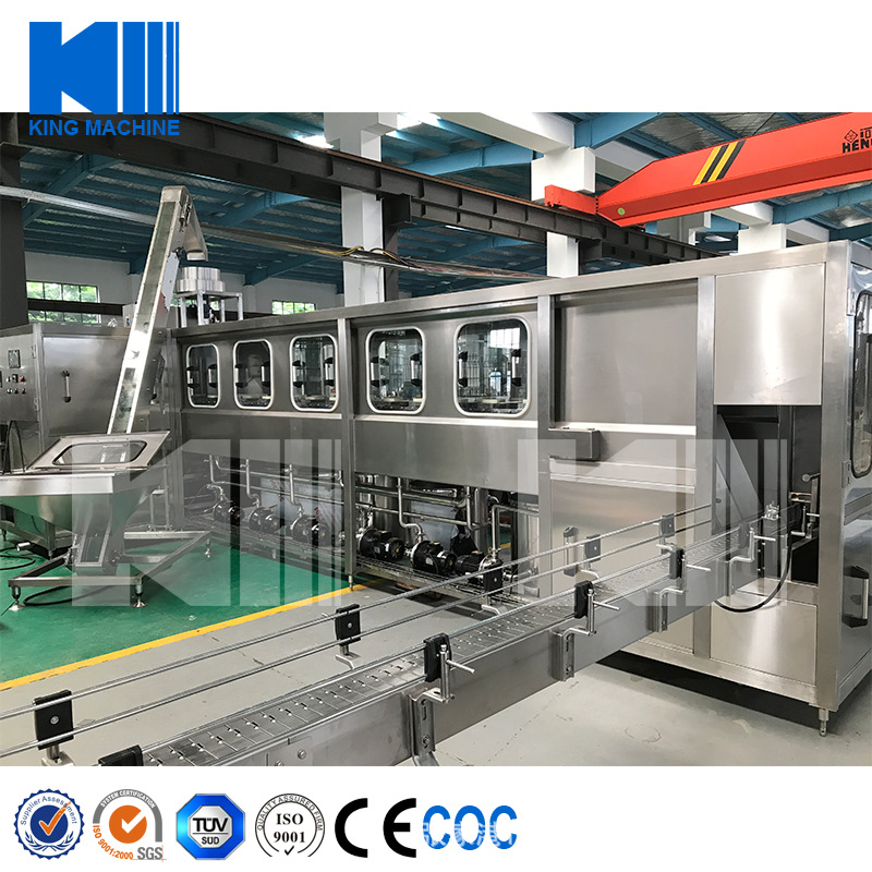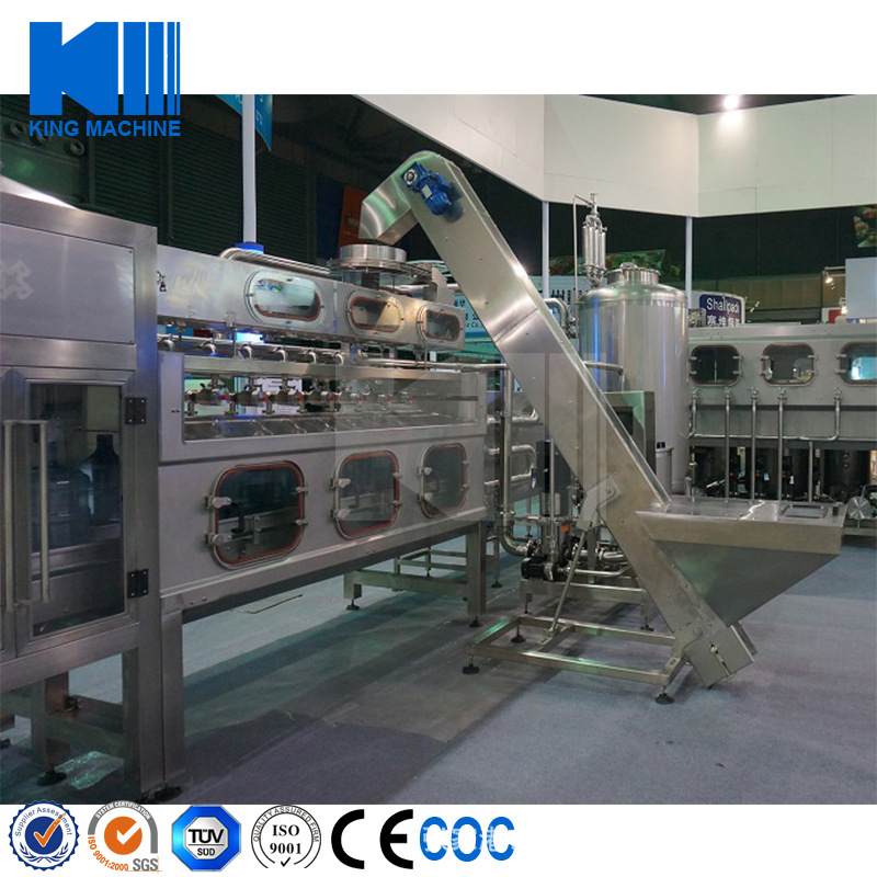 本灌裝生產(chǎn)線(xiàn)專(zhuān)用于3-5加侖桶裝水的灌裝,型號(hào)包括了QGF-100,QGF-240,QGF-300,QGF-450,QGF-600,QGF-900,QGF-1200。合消毒、沖洗、灌裝、壓蓋四為一體。沖洗機(jī)采用了多種洗液以及消毒液對(duì)瓶子進(jìn)行清洗以及消毒,消毒液能夠循環(huán)使用。瓶蓋會(huì)在清洗和消毒后運(yùn)至旋蓋機(jī)自動(dòng)進(jìn)行旋蓋。本產(chǎn)品功能齊全,涵蓋了清洗、消毒、灌裝、旋蓋、計(jì)數(shù)等功能,高度自動(dòng)化,實(shí)為飲料生產(chǎn)廠家理想的優(yōu)選設(shè)備。